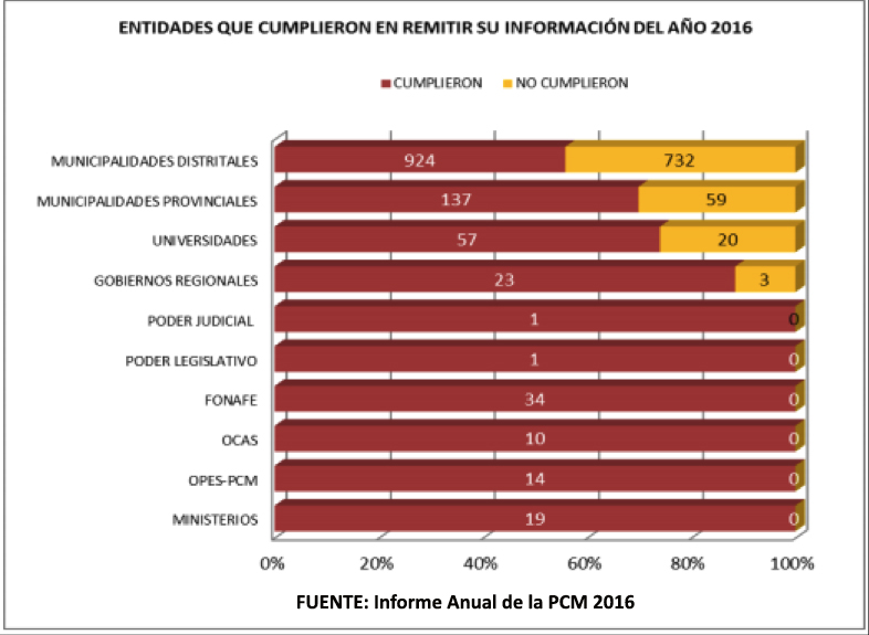 Resulta que, en lo que se refiere al año 2010, solo 395 entidades públicas cumplieron con presentar su reporte, lo que representaba el 19% del total de entidades obligadas a hacerlo ante la Presidencia del Consejo de Ministros. En el año 2016, han sido 1,220 las entidades que cumplieron con remitir su reporte, de un total 2,034, lo que representa el 60%. Este grado de cumplimiento en la presentación de los reportes, desdibuja las cifras de cumplimiento de atención a las solicitudes de información pues no se conoce en realidad cuántas solicitudes de información en realidad existen y cuántas de ellas pudieron haber sido atendidas. Igual estos datos son una aproximación al conocimiento de la evolución de este aspecto del ejercicio de la transparencia en el Perú.