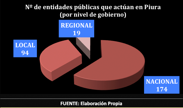 En la región Piura actúan 287 entidades estatales. Son pliegos presupuestales (entidades del Estado que reciben directamente fondos públicos) que de una u otra manera ejercen algún grado de gestión de la amplia temática del gobierno de los temas públicos. En este número están representados el Poder Ejecutivo (con sus 18 ministerios), el Poder Judicial, los organismos autónomos, universidades nacionales, gobierno regional (y sus instancias), municipios provinciales, municipios distritales, etc.