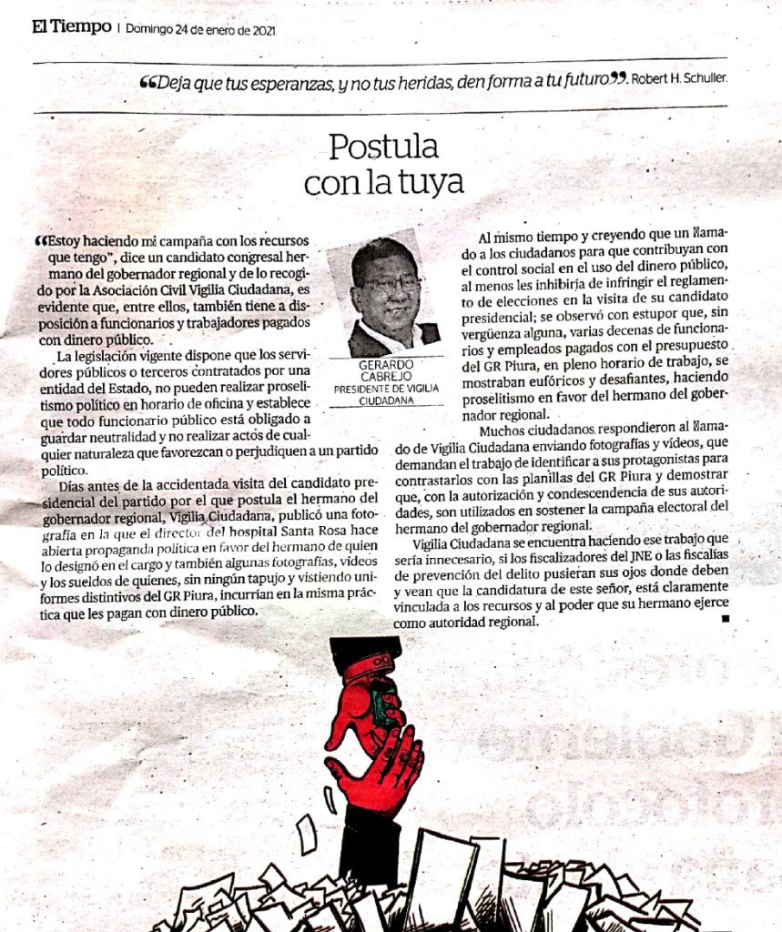 Días antes de la accidentada visita del candidato presidencial del partido por el que postula el hermano del gobernador regional, Vigilia Ciudadana, publicó una fotografía en la que el director del hospital Santa Rosa hace abierta propaganda política en favor del hermano de quien lo designó en el cargo y también algunas fotografías, vídeos y los sueldos de quienes, sin ningún tapujo y vistiendo uniformes distintivos del GR Piura, incurrían en la misma práctica que les pagan con dinero público.