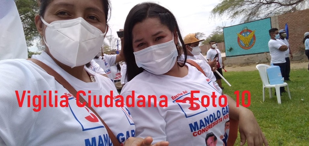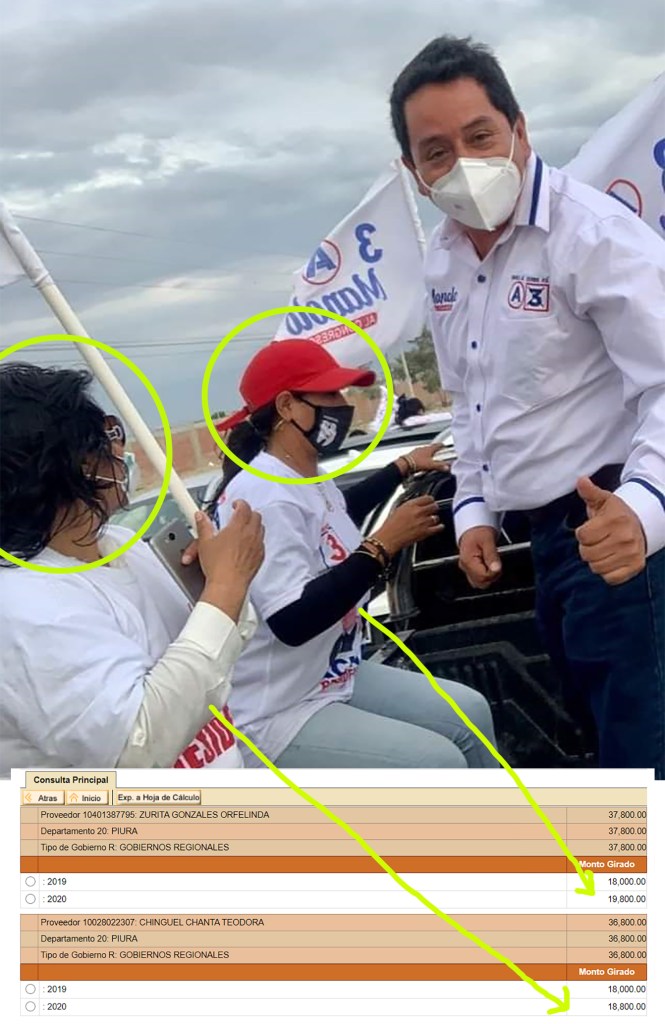 Son de extrema confianza del «Gran Manolo», candidato a congresista y sobretodo de su hermano el gobernador regional, tan así que durante las actividades proselitista del pasado 19 y 20 de enero, acompañan al candidato muy de cerca… Ellas son de izquiera a derecha TEODORA CHINGUEL CHANTA, con DNI 02802230 y ORFELINDA ZURITA GONZALES, con DNI 40138779, ambas supuestamente trabajan por s/ 1,800 mensual; la primera de ellas es nada menos que una de las asistentes de JESÚS TORRES SARAVIA, gerente general del GR PIURA y la segunda trabaja en el Programa de Acción Social o PAS, esa dependencia desde la que regalan pescado,platanos y realizan atenciones médicas en zonas populares y rurales con la finalidad de rentabilizarlo electoralmente.