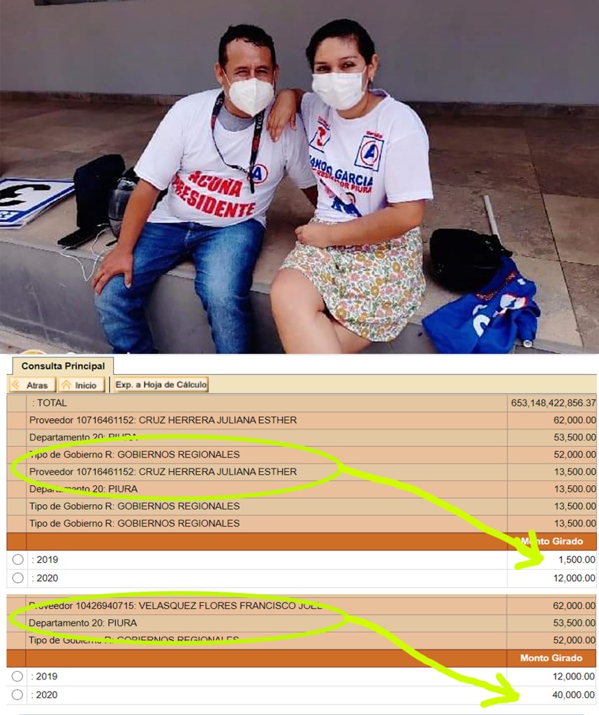 Ellos son FRANCISCO JOEL VELASQUEZ FLORES, con DNI 42694071 y ella es JULIANA ESTHER CRUZ HERRERA, ambos trabajan en la Gerencia de Desarrollo Social; el como coordinador monitos del sector educación con un sueldo de S/ 4000 mensual y ella técnico administrativa con S/ 2000 mensuales por hacer proselitismo en favor delhermano del gobernador regional. Esta fotografía les fue tomada el martes 19 de enero mientras CÉSAR ACUÑA visitaba Piura y MANUEL GARCÍA CORREA, hermano del gobernador regional, promovía su candidatura a congresista.