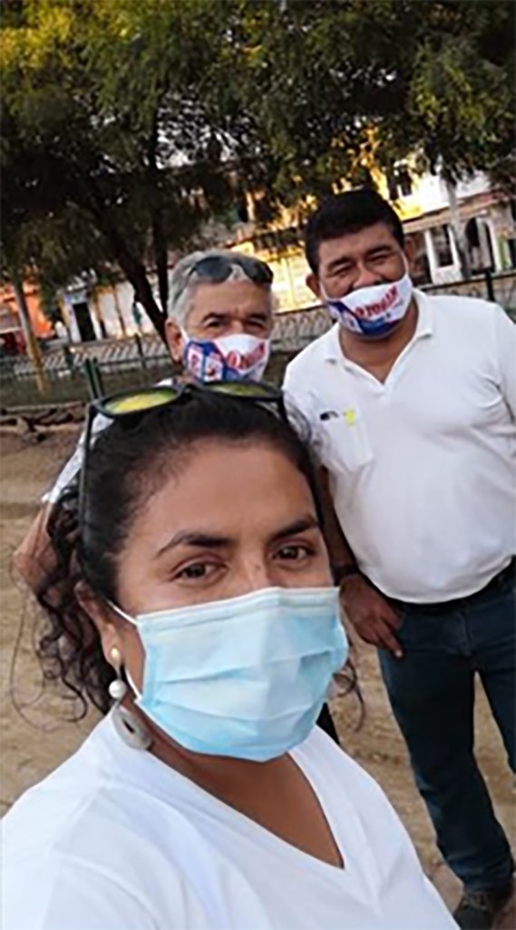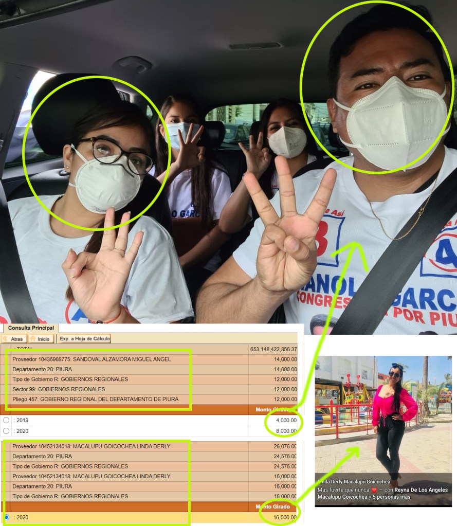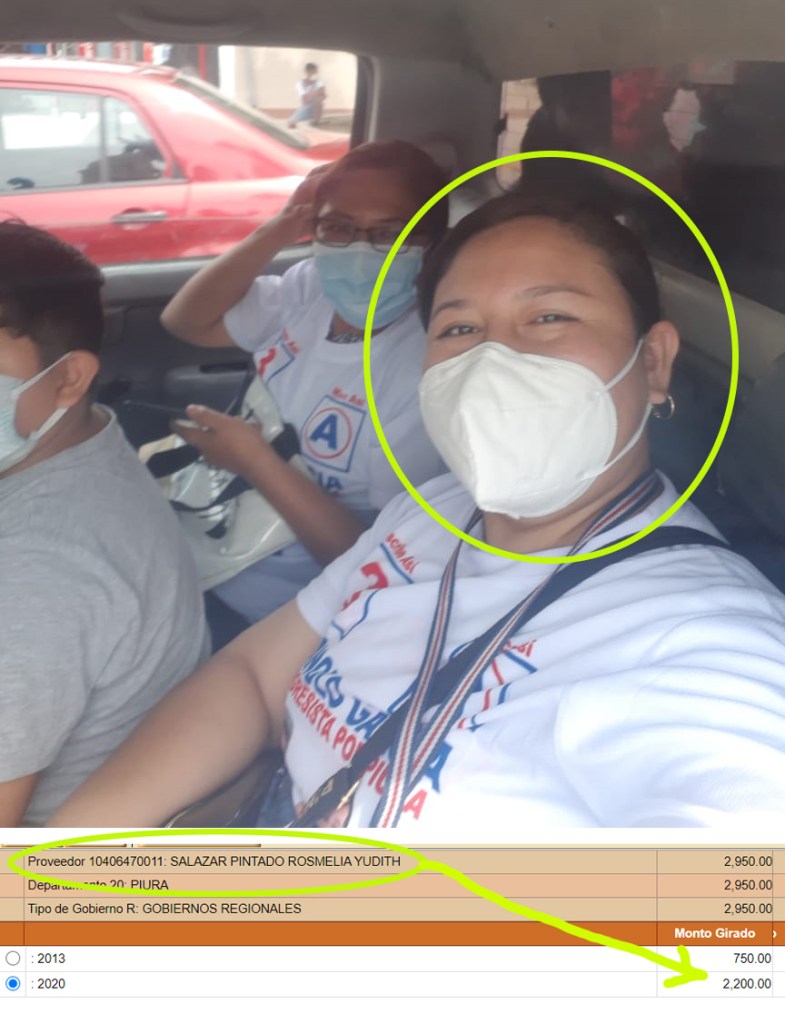 LINDA DERLY MACALUPÚ GOICOCHEA, en plena faena proselitista cuando tendría que haber estado atendiendo enfermos por el COVID pues para ello se le paga del dinero público S/8000 mensual… En la primera foto tomada desde dentro de su camioneta, se puede ver su identificación del centro médico de estética SOLEIL, siguiendo a otro vehículo con adherentes de MANUEL GARCÍA CORREA… En la siguiente fotografía, a su derecha se observa a LUIS ENRIQUE OTOYA HEREDIA, otro operador proselitista de la campaña del hermano del gobernador regional y a quien, por hacer lo que hace, se le paga con dinero público