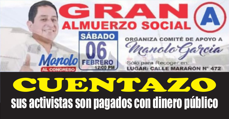 En medio del tráfago que vivimos por la pandemia, la cuarentena y la pérdida de empleo de millones de peruanos, hay quienes la pasan bien cobrando un sueldo por hacer proselitismo político en favor de IDELSO MANUEL GARCÍA CORREA, candidato a congresista por el partido Alianza para el Progreso (suyo) y hermano del gobernador regional SERVANDO GARCÍA CORREA…