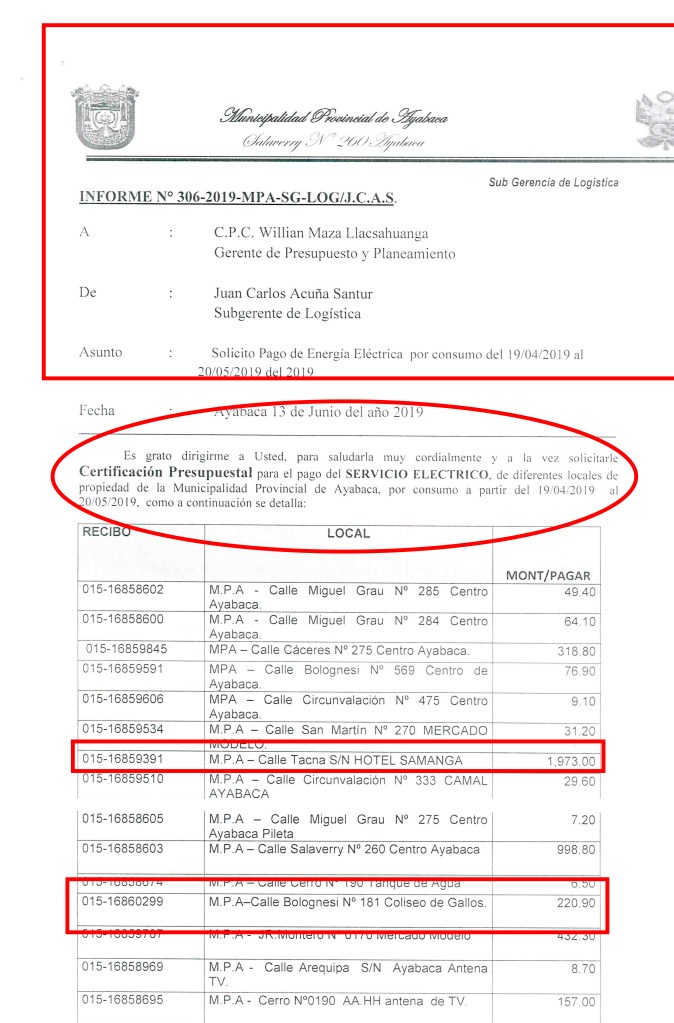 El “coliseo de gallos” está ubicado en calle Bolognesi 181, muy cerca de la plaza de armas y de la sede municipal y tal como VIGILIA CIUDADANA lo comprobó, consultando el número de suministro en el sistema de cobranza electrónica de ENOSA, la municipalidad tiene dos meses de atraso en el pago por servicio de energía eléctrica y, pese a ello, el alcalde DARWIN QUINDE RIVERA, autorizó y/o facilitó el uso por un tercero, de uno de los bienes que tiene bajo su custodia y administración, lo que sin duda se enmarca en el delito de “peculado de uso”.