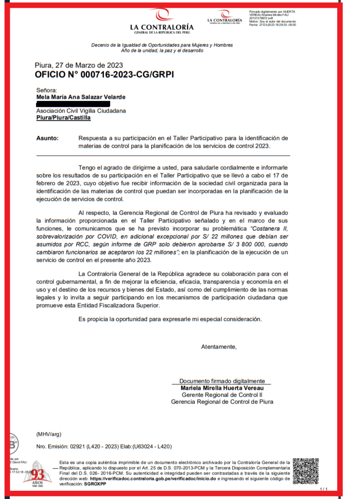 Presentamos este caso y, hace pocos días, la @Contraloría nos notificó que lo incorporará a la programación de servicios de control para el 2023 lo que ciertamente nos satisface pues sentimos que no estamos arando en el mar… Lo malo es tener que esperar dos años para que se empiece a hurgar en los procedimientos de, apenas, un caso grave de corrupción en el GR PIURA y son muchos los que se deben revisar de la gestión de SERVANDO GARCÍA como de los alcaldes provinciales y distritales del periodo anterior…