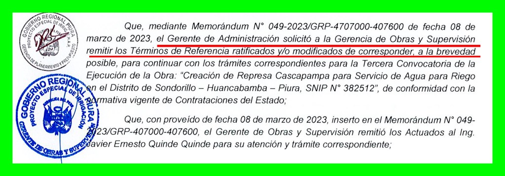 Sospechosamente, una de las primeras acciones del cuestionado CÁRDENAS BERECHE para empezar la nueva convocatoria de la presa de CASAPAMPA, fue el intento de modificar los Términos de Referencia (TDR) del proceso, lo que estaba impedido de hacer pues OSCE, mediante la Opinión Nº 052-2019 establece que, si las razones que motivaron la declaratoria de desierto de un proceso no están vinculadas a los TDR, el contenido de los mismos no puede modificarse. Es de señalar que los motivos que dieron lugar a que se declare desierta la convocatoria anterior, estuvieron referidos a que el entonces postor ganador CONSORCIO ALTO PIURA, conformado por las empresas SCORPION CONTRATISTAS GENERALES SAC y MULTISERVICIOS PUNRE SRL, se excedieron en el plazo que las normas establecen para presentar la documentación que de sustento a su oferta técnica y así firmar el contrato; tal como lo señala el INFORME Nº 631-2022/GRP-407000-407600 que aquí presentamos. Es decir, la causa de que el anterior proceso de adjudicación haya sido declarado “desierto”, no tiene nada que ver con los TDR que dieron sustento a la convocatoria inicial.