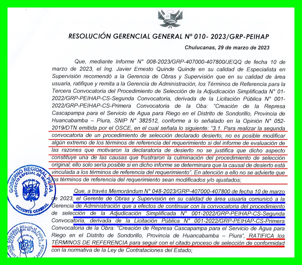 Resolución de Gerencia General Nº 010-2023/GRP-PEIHAP que consigna declaración de adjudicación desierta en la anterior convocatoria, informe de la imposibilidad de modificar los Términos de Referencia, la ratificación de los mismos que señala el gerente de supervisión y obras, como también la conformación del nuevo Comité de Adjudicación.