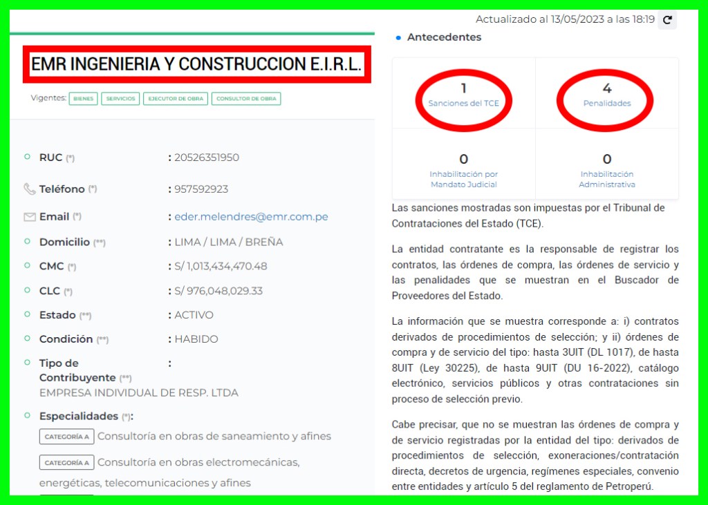 Por su parte EMR INGENIERÍA Y CONSTRUCCIÓN EIRL, representada por EDER FAVIO MELENDRES CHUQUILLANQUE, fue sancionada y multada junto a INKAPESCA por subcontratar servicios sin autorización de la entidad. EMR recibió una multa de más de un millón de soles el 15 de febrero de 2021.