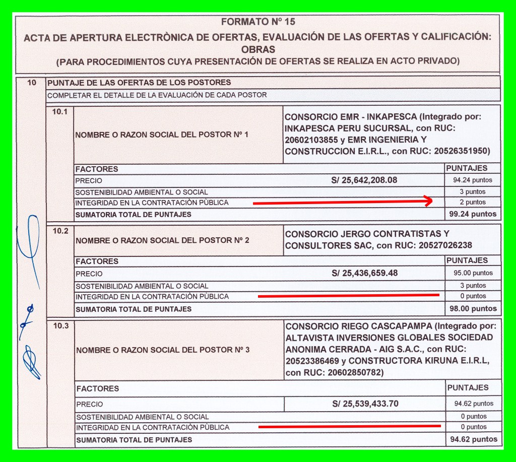 Lo llamativo y tal como se puede ver en el Acta de Ofertas y Puntajes asignados a los postores, el consorcio ganador inclinó la balanza a su favor y ganó el proceso de adjudicación por gozar de integridad en la contratación pública, factor por el que le asignaron 2 puntos, con los que pudo superar a su competidor que quedó en segundo lugar y que le llevaba una ventaja mínima en la oferta económica, al igual que el que quedó en tercer lugar. El cuarto postor fue descalificado en instancias previas.
