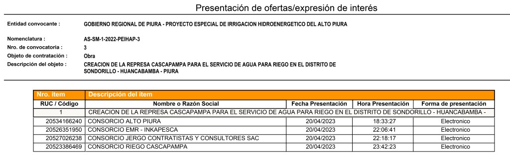 Según el portal del OSCE, el consorcio EMR-INKAPESCA recibió la buena pro de la presa CASAPAMPA el último 26 de abril y, a la fecha, se encuentra en la denominada etapa de perfeccionamiento del contrato. Esto es, presentar la documentación que sustenta su oferta técnica que luego de ser validada, quedaría expedita para firmar el contrato para la ejecución de la obra.