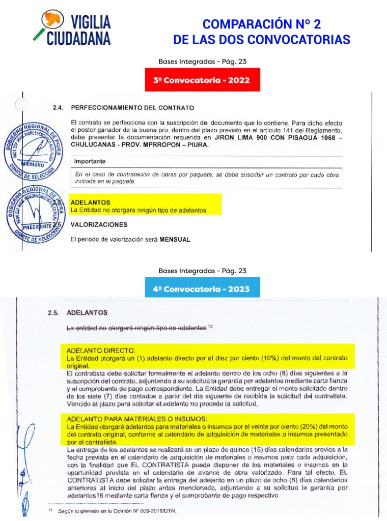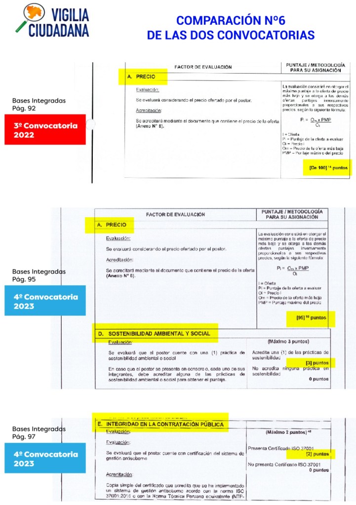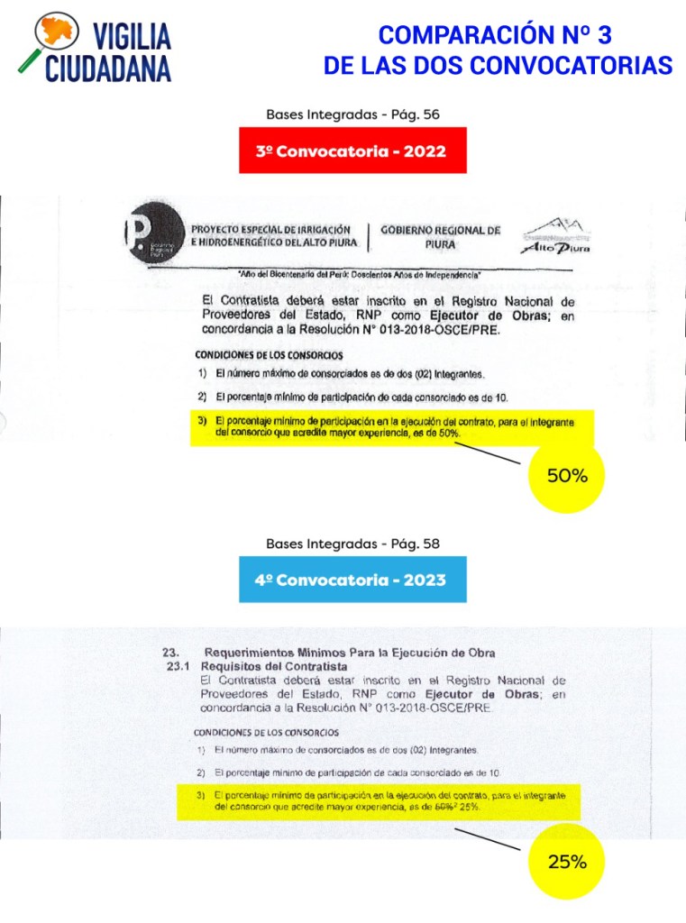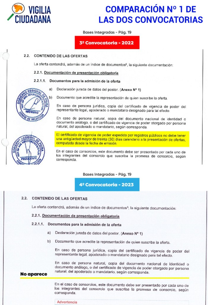 VIGILIA CIUDADANA ha comparado minuciosamente los TDR originales y que no podían cambiarse por los del proceso de adjudicación presidido por CÁRDENAS BERECHE (en adelante, «TDR CÁRDENAS 2023»). El resultado indica que se realizaron modificaciones sustanciales no solo a los TDR, sino también a las Bases Administrativas del proceso. A todas luces un hecho ilegal que debería generar la nulidad de este proceso de adjudicación y poner en alerta al gobernador regional, a la #Contraloría y a la #FiscalíaAnticorrupción pues se si se tiene en cuenta que quitan requisitos, acomodan la experiencia, bajan monto de línea de crédito y límites de solvencia económica, el direccionamiento es bastante claro.