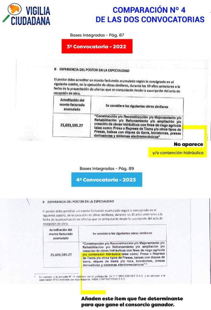 Construir presas o represas, no es lo mismo que hacer obras “de contención hidráulica”. Una obra de contención puede ser construir un muro con el fin de obtener un área de terrenos horizontal o contener el empuje de tierras en una carretera. En esto sí tienen experiencia las empresas que ganaron la adjudicación, por lo que el direccionamiento consiste en hacer que esta experiencia sea equivalente a construir un presa, represa o embalse de agua, justamente la experiencia de la que carecen. Por lo tanto, la experiencia del postor no va acorde al objeto de la contratación, ya que la obra es con fines de control de inundaciones
