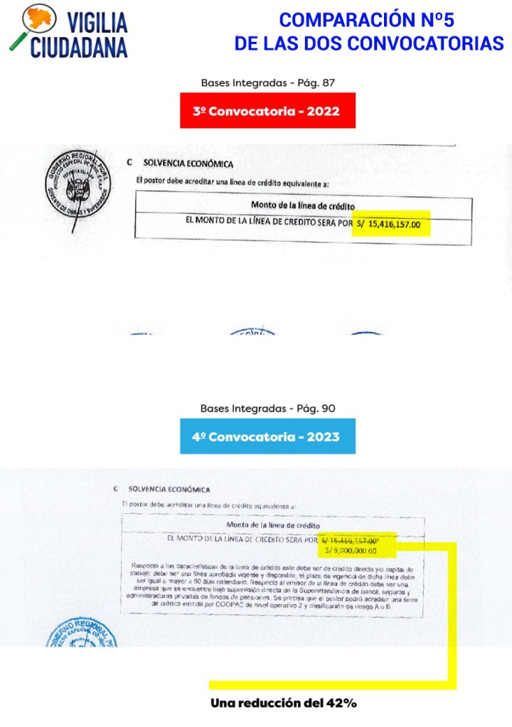 Se bajó la valla de la solvencia económica de 0.6 del monto del contrato a solo 0.25 y a la vez consintieron que la línea de crédito baje de S/15 millones 416.157 a solo S/ 9 millones y pueda emitirla una cooperativa de ahorro y crédito de nivel operativo 2 y calificación de riesgo A o B. que, en general su capital es muy inferior a la línea de crédito que emiten.