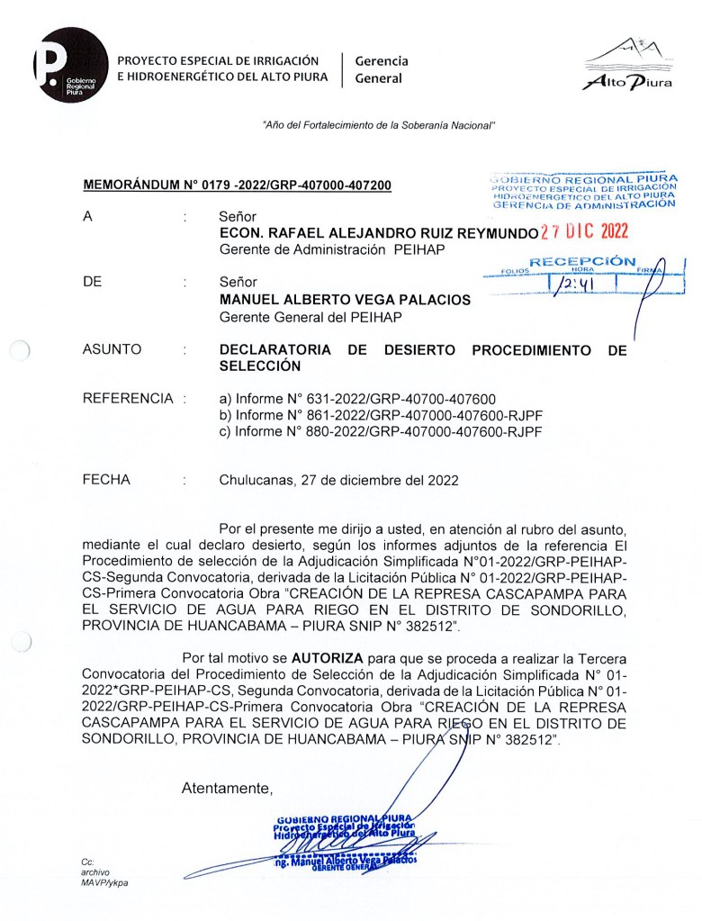 Con el cambio de administración regional, el pasado 05 de enero, el ING. CARLOS MIGUEL CABREJOS VÁSQUEZ asume como Gerente General del PEIHAP; tres días después es RONALD CÁRDENAS BERECHE quien asume como Gerente de Obras y Supervisión en la misma entidad. Una de las primeras acciones de esta dupla fue realizar una nueva convocatoria de la presa de CASAPAMPA, otra vez bajo la modalidad de licitación simplificada; sin embargo, las suspicacias no se hicieron esperar entre los agricultores y profesionales del Alto Piura, toda vez que la responsabilidad técnica del proyecto recayó en CÁRDENAS BERECHE; ingeniero que si bien tiene una maestría en ingeniería hidráulica en la UDEP, carece de experiencia alguna en la construcción de obras públicas y mucho menos en el rubro de construcción de presas y proyectos de irrigación; ello sin considerar los cuestionamientos por sus antecedentes penales pues tiene en su haber tres sentencias judiciales que van desde corrupción de funcionarios por la entrega de créditos ilegales del Banco de Materiales a sus familiares; atropello, fuga y exposición de personas al peligro; hasta maltrato físico a su ex pareja y omisión de alimentos a hijos menores de edad.