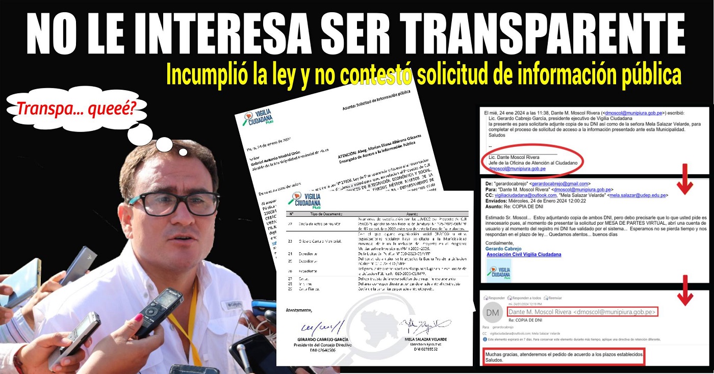 El pasado 24 de enero, la Asociación Civil VIGILIA CIUDADANA, presentó a la #MuniPiura una solicitud de acceso a la información pública con 29 puntos a atender. Al día siguiente de hacerlo, vía correo electrónico, el jefe de atención al ciudadano DANTE MOSCOL RIVERA, pese a habernos identificado en la plataforma electrónica, solicitó le enviemos copia del DNI y en sucesivo correo nos dijo que atenderían nuestro pedido en los plazos establecidos… Transcurrió el plazo de 10 días útiles señalados en la ley y también los dos adicionales que la entidad puede solicitar y simplemente, no han respondido, nada de nada… ¿A qué le teme el alcalde Madrid? ¿A qué le temen sus funcionarios? ¿Entregar esa documentación los pondría al descubierto? A continuación, la lista de la documentación solicitada y, en resguardo de nuestro derecho a que se nos entregue dicha información, iremos en denuncia ante el #TribunalDeTransparenciayAccesoa la Información Pública…