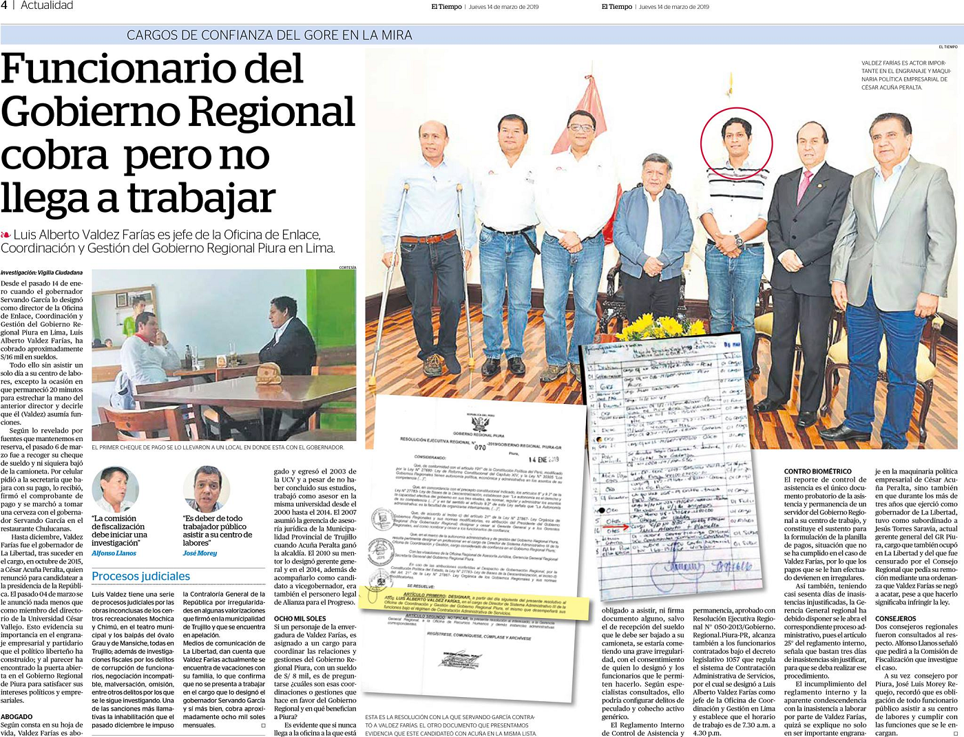 Este tipo de delincuentes empiezan a caer cuando los desborda el dinero y hacen compras que no pueden justificar. ¿RECUERDAN A LUIS VALDEZ? Fue el primer denunciado de VIGILIA CIUDADANA en la gestión de SERVANDO GARCÍA y ahora, él y su cónyuge, son nuevos millonarios y compran casas de un millón de dólares… VIGILIA CIUDADANA lo denunció en marzo de 2019 pues fungía de gerente de la oficina de coordinación del GORE PIURA en Lima y nunca fue a trabajar, solo llegaba cada mes, estacionaba su auto en la acera de donde queda la oficina y por celular llamaba para que le bajen el cheque… es el mismo que puso a JESÚS TORRES SARAVIA como gerente general del GR y ya saben que éste terminó en la cárcel por aceptar una carta fianza falsificada por S7 4 millones de soles y ya saben también de quién recibía órdenes y repetidamente denunciamos sus negociados y corruptelas por cientos de millones en obras públicas… Y recuerden también que, en compensación, puso al tal MANOLO (Idelso Manuel García Correa) como candidato a congresista por el partido de «Plata como Cancha» ACUÑA y al hermano de TORRES SARAVIA lo tenía como asesor congresal… Lean este reportaje de «EL FOCO»...