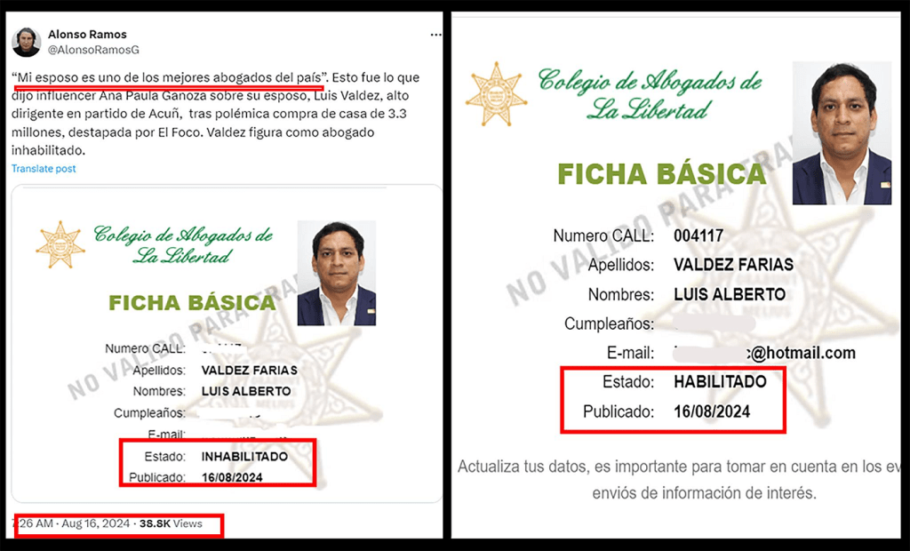 Muy temprano por la mañana, el reconocido periodista ALONSO RAMOS hizo una verificación de la colegiatura del tal VALDEZ y lo encontró INHABILITADO por el Colegio de Abogados de La Libertad, lo que publicó en su cuenta de “X” a las 7.26 de la mañana de este 16AGO… Este mismo 16AGO, queriendo tapar el sol con una de sus uñas, VALDEZ FARÍAS inmediatamente corrió para pagar sus adeudos y aparecer como HABILITADO… Lo que no podrá ser ni hacer, es ni siquiera parecer uno de los mejores abogados del país… Nunca ha litigado ni ejercido como juez o fiscal pues se dedicó siempre a vivir bajo la sombra de su “padrino” CÉSAR ACUÑA y como éste mismo dice, con él se gana “plata como cancha”…