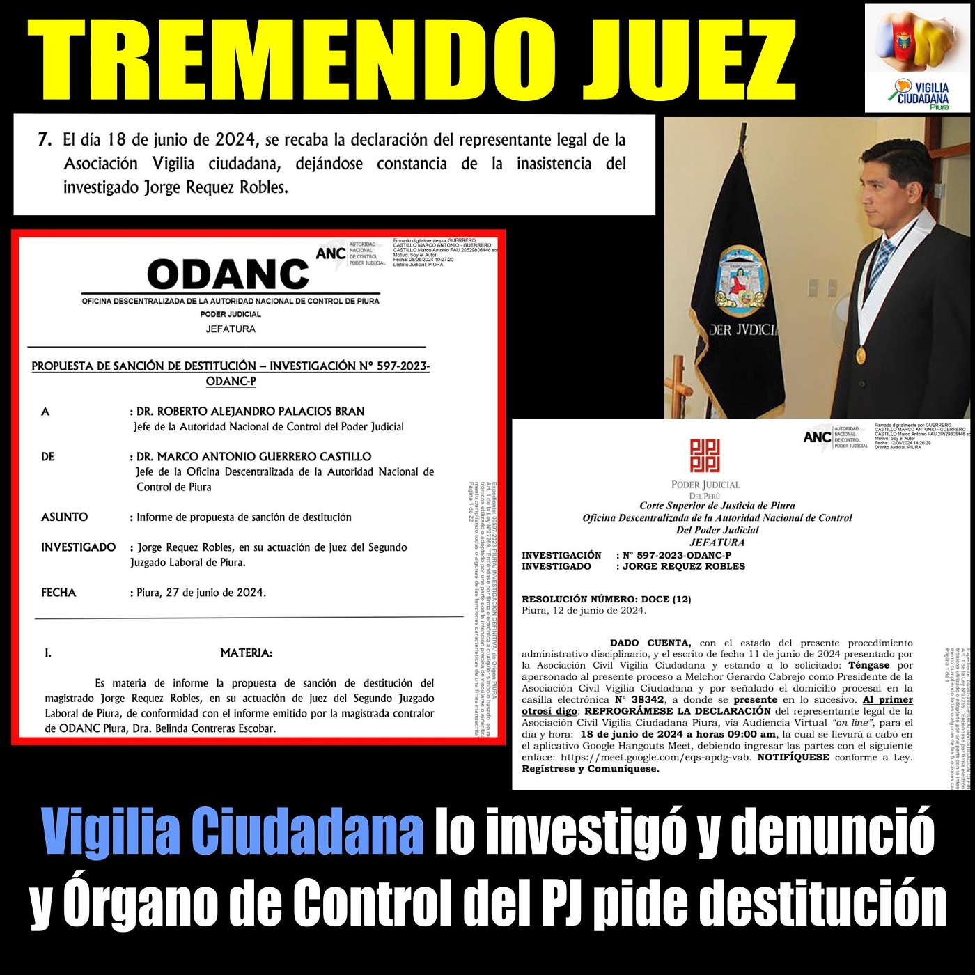 Teníamos toda esta información, pero sobre todo, nos interesaba probar el tráfico de medidas cautelares… Al no redondear la investigación, se optó porque la información acopiada sea puesta en conocimiento de la Autoridad de Control del Poder Judicial y sean ellos quienes completen la investigación… Después de casi un año, dicho órgano pudo probar la denuncia del intercambio de decisiones jurisdiccionales a cambio de favores sexuales; razón suficiente para solicitar a la Autoridad Nacional de Control y a la Junta Nacional de Justicia, la destitución de este mal juez de nombre JORGE RÉQUEZ ROBLES, quien estuvo a cargo del Segundo Juzgado Laboral de la Corte Superior de Piura y quien, optó por no concurrir a la audiencia a la que el representante legal de VIGILIA CIUDADANA fue citado para sostener y dar testimonio de los hallazgos y evidencias en contra de este individuo cuya conducta, es una afrenta para los jueces justos y probos que sí existen…