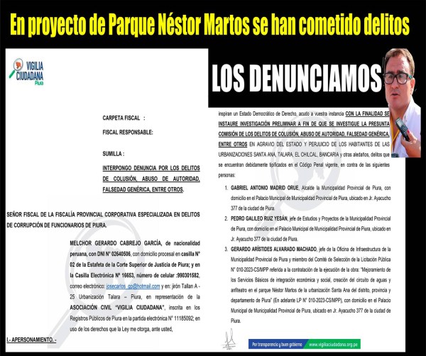Para leer denuncia completa, haga clic sobre el enlace que está más abajo. La Asociación Civil “VIGILIA CIUDADANA”, presentó ante la FISCALÍA PROVINCIAL CORPORATIVA ESPECIALIZADA EN DELITOS DE CORRUPCIÓN DE FUNCIONARIOS DE PIURA, una denuncia contra el alcalde provincial de Piura, GABRIEL MADRID ORUÉ y otros, por los delitos de COLUSIÓN, ABUSO DE AUTORIDAD, FALSEDAD... Leer más →