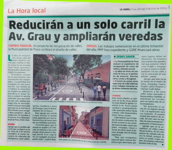 Respecto del conjunto de proyectos de remodelación urbana que la Municipalidad Provincial de Piura viene anunciando, es importante no solo la transparencia en el uso y gestión de los recursos públicos sino también, es esencial la participación ciudadana... Esto es lo que proponen los vecinos de Piura. 1. Coordinar con entidades importantes como la Cámara... Leer más →