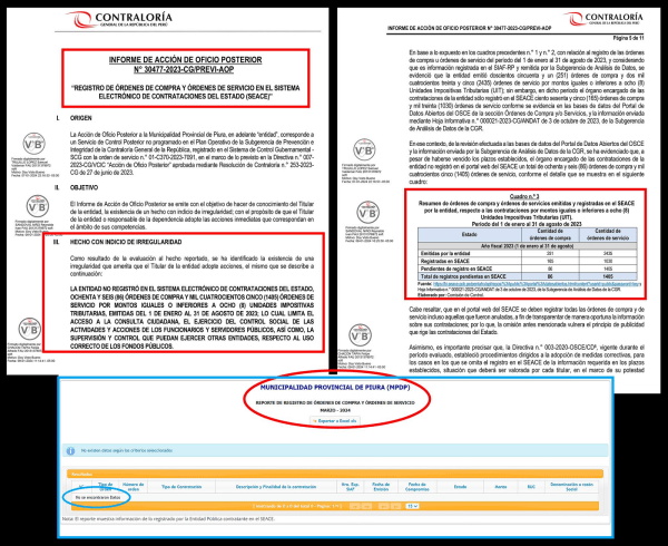 La Contraloría encontró que de 2,435 órdenes de Servicio que emitió la #MuniPiura entre enero y agosto 2023, solo registró 1030 en el portal de SEACE, ocultando 1405 y de 251 órdenes de Compra, solo registró 165 ¿Por qué? Las entidades públicas sin excepción deben registrar en el portal web del SEACE todas las órdenes de compra... Leer más →