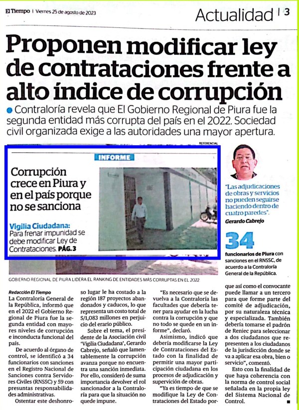 Para leer denuncia completa, haga clic sobre el enlace que está más abajo. La Asociación Civil “VIGILIA CIUDADANA”, presentó ante la FISCALÍA PROVINCIAL CORPORATIVA ESPECIALIZADA EN DELITOS DE CORRUPCIÓN DE FUNCIONARIOS DE PIURA, una denuncia contra el alcalde provincial de Piura, GABRIEL MADRID ORUÉ y otros, por los delitos de COLUSIÓN, ABUSO DE AUTORIDAD, FALSEDAD... Leer más →